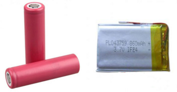 自左向右分別為標準的18650鋰電池、鋁塑復合膜封裝的聚合物鋰離子電池以及用于應急電源使用的倍率鋰離子電池