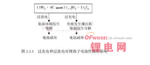 在鋰離子電池的研究開發(fā)中,提高使用安全性問題一直是研究的重點。由于質(zhì)量比能量高,而且電解液大多為有機易燃物等,當(dāng)電池?zé)崃慨a(chǎn)生速度大于散熱速度時,就有可能出現(xiàn)安全性問題。有研究指出,鋰離子電池在濫用時,有可能達到700°C以上的高溫,從而導(dǎo)致電池出現(xiàn)冒煙、著火乃至爆炸;在過放電到低于1V時,正極表面將析出銅,造成電池內(nèi)部短路;在過流情況下,電池內(nèi)部溫度也極易升高,使電池性能惡化乃至損壞。圖1.1.1給出了在過充電和過放電情況下,鋰離子電池內(nèi)部的化學(xué)反應(yīng)及性能的變化,式中M代表Co、Al、Ni等金屬離子。