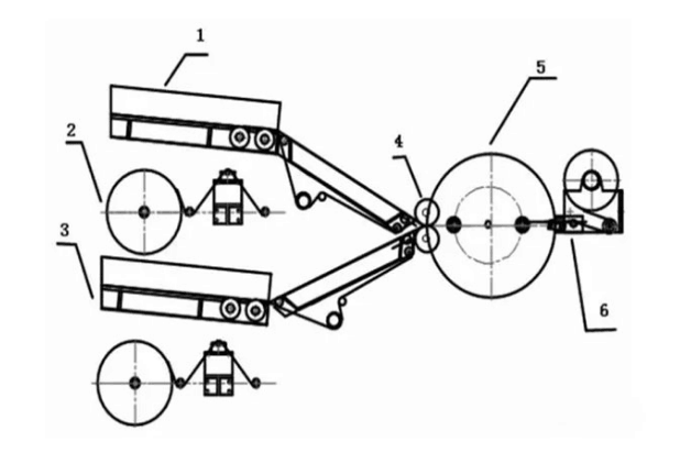 1.正極片送料機(jī)構(gòu)2.隔膜放卷機(jī)構(gòu)3.負(fù)極片送料機(jī)構(gòu)4.軋壓輥5.卷繞機(jī)構(gòu)6.封貼及切斷機(jī)構(gòu)
