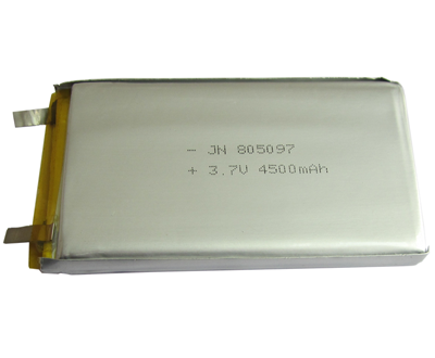 3.7V 4500mAh高溫聚合物鋰電芯 電池型號:JN805097 標稱電壓:3.7V 標稱容量:4500mAh(0.2C放電至2.75V) 出廠電壓:3.7V~3.9V 產品尺寸:MAX97508.0mm 產品內阻:40m 執(zhí)行標準:GB/T 18287-2000 保質期限
